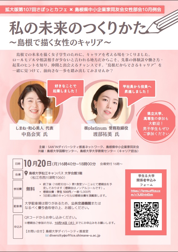 今回は、島根県中小企業家同友会との合同企画として、「私の未来のつくりかた ~島根で描く女性のキャリア~」をテーマに、島根での未来を描く女子学生の皆さんに向けたキャリア形成のヒントをお届けします。