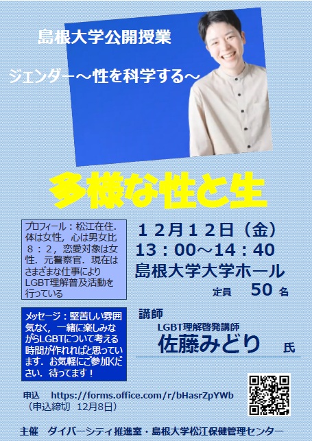 公開日 2025年10月06日 12月12日(金)13:00~14:40,教養教育課目 「ジェンダー~性を科学する~」より「多様な性と生」の授業を,公開授業として行うことになりました。 講師としてLGBT理解啓発講師 佐藤みどり氏をお招きしています。 興味のある方はぜひご参加ください。下記QRコードよりお申し込みいただけます。 ジェンダー2025チラシ[PDF:709KB] 申込締切:12月8日(月)
